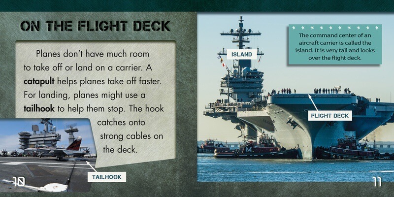 Aircraft carriers have played an important role in the military for over 100 years. These floating airports have evolved over time to provide a base for jets, helicopters, airplanes, and thousands of sailors at sea. This book introduces young readers to the history of aircraft carriers with facts about their use in the U.S. Navy. Full-color photographs bring the massive machines to life and help readers understand how they operate. Readers look beyond the flight deck to see how all the moving parts come together and keep these massive machines afloat.