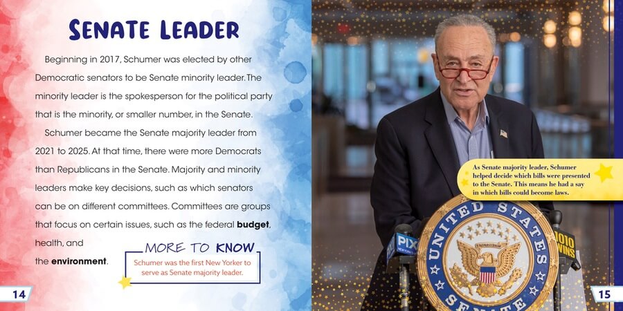Charles Ellis Schumer, better known as Chuck Schumer, has been a leader in the U.S. Senate many years. Schumer's political career began in the New York State Assembly in 1975, after finishing law school. A public servant nearly his whole adult life, Schumer's considerable experience has informed how he tackles tough issues in Congress. This accessible biography of the high-profile Democratic politician tells the story of his rise in politics and accomplishments in office. Colorful photographs, interesting fact boxes, and a timeline reinforce key ideas in this informative volume, which supports components of the science of reading.