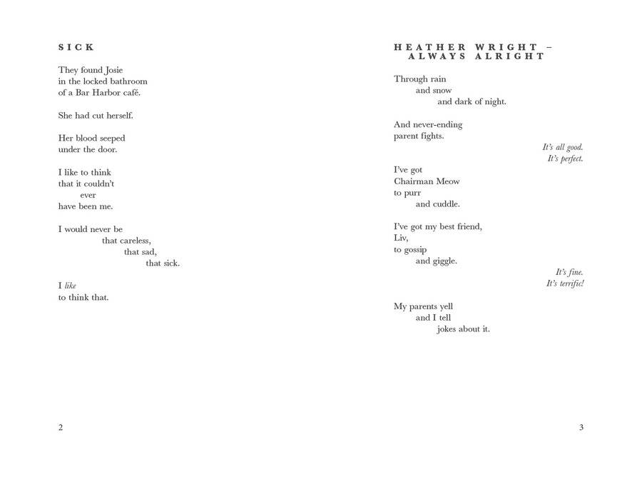 Heather Wright is always all right. That's what people say. But if she's always all right, then why is life so hard? Heather starts cutting as a way to deal with the difficult emotions she locks inside. But what starts out as casual cutting turns into a dangerous addiction. When Heather goes away to summer theater camp, she meets Josie—a tough, sassy diva who is more than just a cutter, but a cutting advocate online. Heather looks up to Josie until the darkness of Josie's inner world threatens to spill out over the side and drown both of them. Until Josie does the unthinkable.