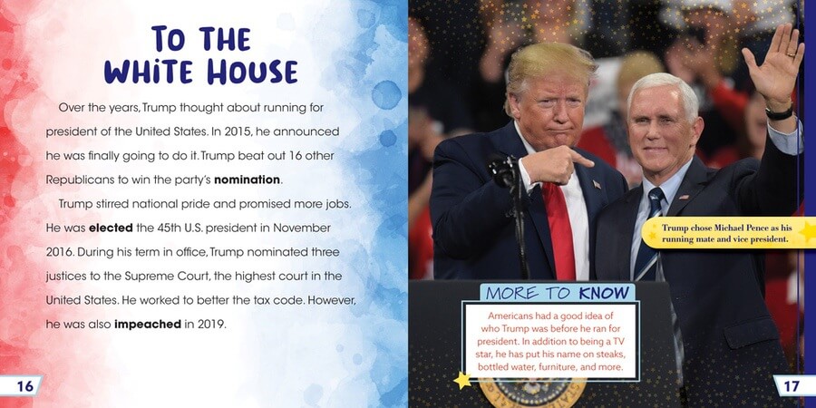 Serving non-consecutive presidential terms is a feat only achieved by a few in the history of the United States—and Donald Trump is one of those who have done it! In this essential biography, readers learn how Trump started out in business and went on to shake up both the Republican Party and the United States in general. Interesting facts and accomplishments are highlighted in the text written especially for lower elementary readers. A concluding timeline aids comprehension while the volume supports knowledge building, a key component of the science of reading.