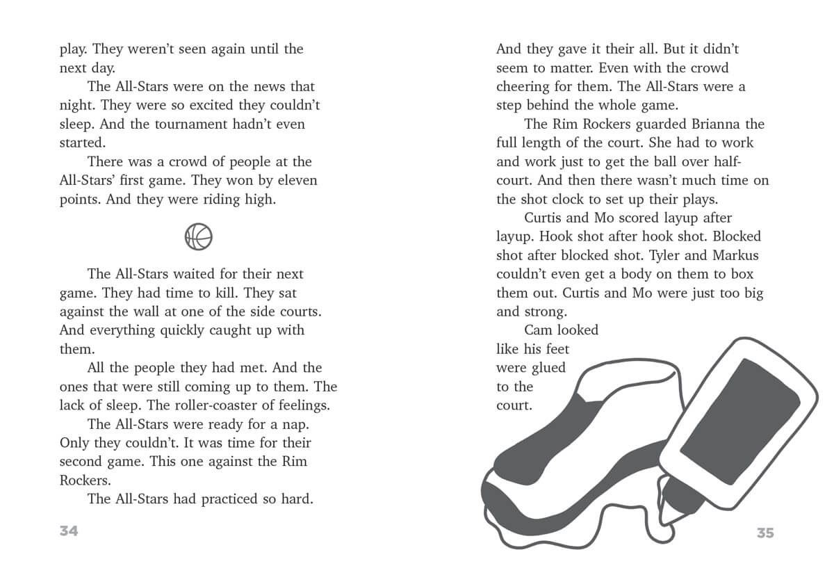 It's the annual citywide youth basketball tournament. Youth teams from all over the city have come together to play on a real pro basketball court. The All-Stars quickly realize they're in over their heads. Other teams have real coaches, real uniforms, great sneakers, and real tournament experience. All the All-Stars have is talent and determination. The team has to make a decision: give up and go home, or play to win.