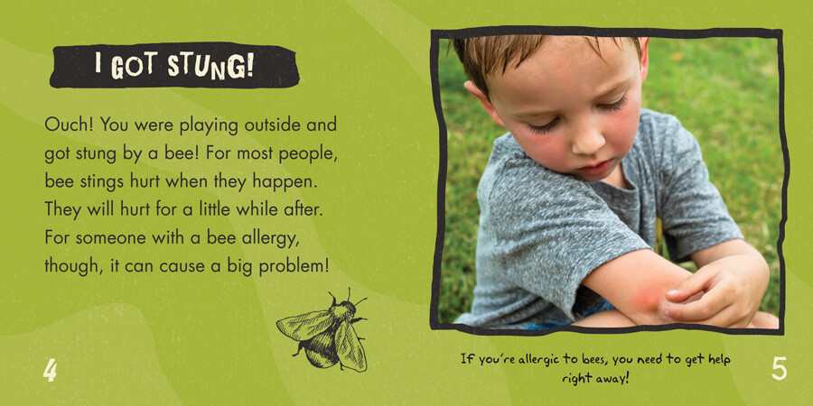Millions of people in the United States are allergic to bee stings—and serious reactions can be life-threatening. Though this sounds scary, preparation can help! Readers of this volume learn what to do if they or a friend are stung by a bee and have a normal reaction, as well as what to look for if an allergic reaction is occurring. Age-appropriate content and language explain what happens when someone has an allergy. The text is accompanied by full-color photographs of normal and allergic reactions to bee stings, preparing readers further for any situation they may face.