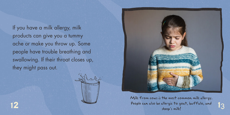 Babies under a year old can have an allergy to milk that follows them into childhood. However, most kids don't have severe allergic reactions to milk products and many will eventually outgrow an allergy. In this book, readers learn the signs of a milk allergy and what foods they should avoid if they are allergic to milk. Colorful, relatable photographs complement age-appropriate explanations and science information about an important subject readers will likely encounter in their own life or that of a friend.