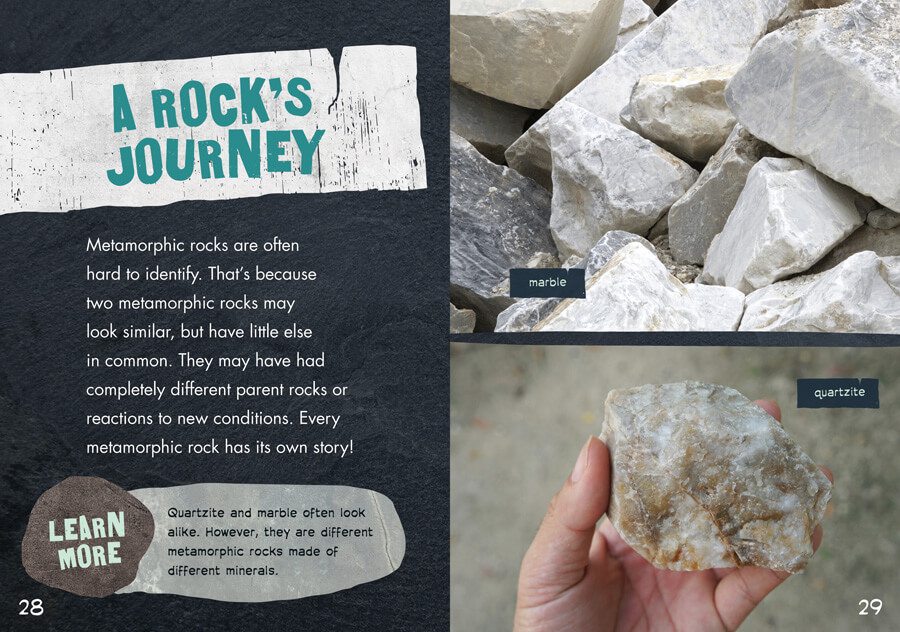 Metamorphic rocks are a great example of change; they start out as another kind of rock, but change dramatically under high pressure, heat, or another natural force. This book introduces readers to this fascinating part of the rock cycle, using bright color photographs and accessible hi-lo text. Readers will learn about common metamorphic rocks such as schist and marble, including how they were made and how they're used. Graphic organizers and fact boxes showcase exciting information about this kind of rock. Readers will come to appreciate why metamorphic rocks… rock!