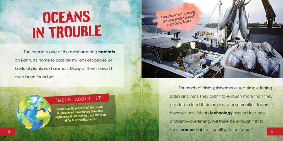 There are always more fish in the sea, right? While that idiom is popular, it doesn't reflect the current state of Earth's oceans. Humans have greatly overfished many bodies of water, leading to changes in ecosystems and environmental disturbances. Readers learn about the delicate balance of marine habitats and how overfishing can cause huge issues. Including a graphic organizer and fact boxes, this book explores the issue of overfishing, complete with age-appropriate photographs. Readers are encouraged to think about what can be done to save marine habitats—for good.