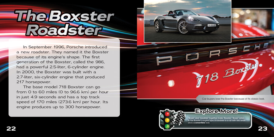 Take readers on a front-seat journey through the fascinating history of the Porsche. At the turn of the century, Ferdinand Porsche produced an automobile called the Lohner-Porsche. This electric car was brought to public attention at the Paris World Fair in 1900, where it caused quite a stir. In 1934, the Volkswagen Beetle was created. In 1948, the Porsche 356 became the first Porsche sports car. By studying the fascinating history of the Porsche, readers will come to understand how the evolution of cars shaped history. The high-interest material is paired with helpful features, which make the information pop.
