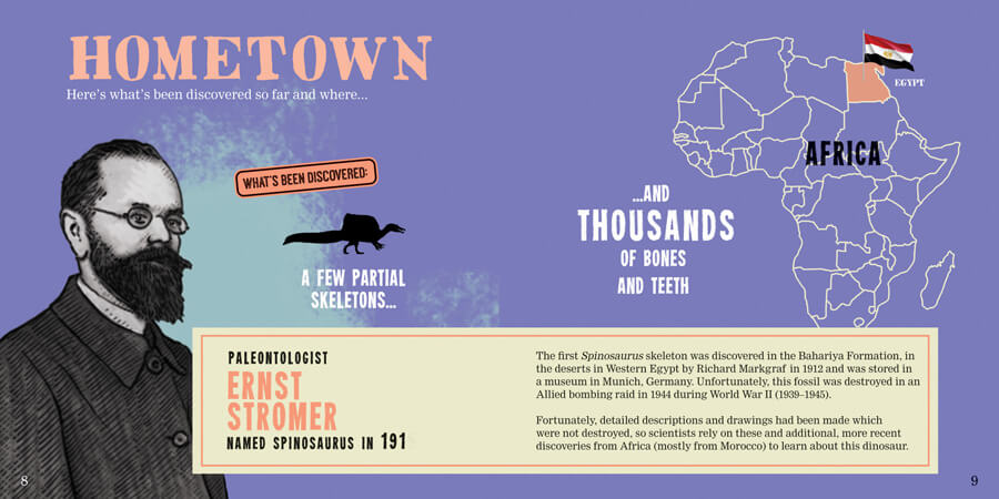 A carnivore that was longer and heavier than the iconic T. rex –– the Spinosaurus was the biggest meat-eating dinosaur and moved on two legs during the late Cretaceous period. Readers learn that the Spinosaurus spent a lot of time in water, and notably had a large sail on its back that could grow to 7 feet (2.1 m) high! Age-appropriate images and infographics accompany the many fun facts readers learn throughout the guide, and they can even discover the fossils of the animal as well as weather conditions during its time on Earth.