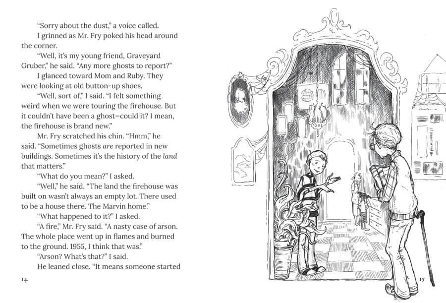 While on a tour of the brand-new firehouse with his friends, Graveyard Gruber feels an urgent tug from an invisible hand. Stories of a vacant house burned to the ground on the very same site, suspicions of arson, and a strange boy seen running from the blaze add to the mystery. Can an unexpected classmate provide the missing clue? Graveyard Gruber eagerly agrees to help out at the firehouse, determined to solve the mystery and set the record straight.
