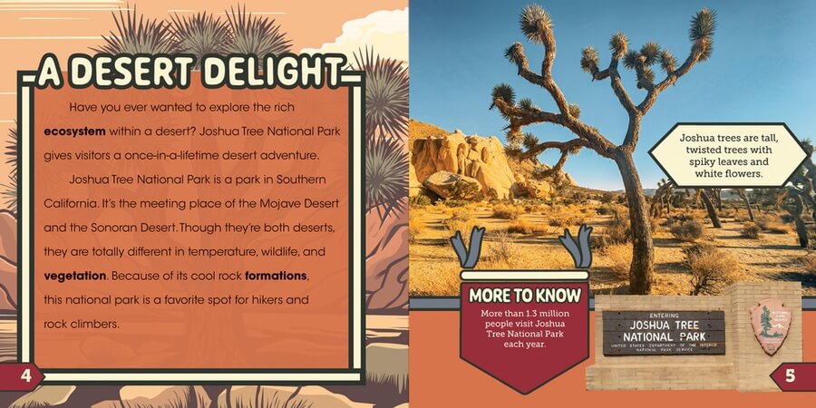 People have lived on the land that is Joshua Tree National Park for 10,000 years or more! Their culture plays a big role in this park, which was first set aside as a national monument in 1936. Readers learn the history of Joshua Tree National Park and more in this fascinating book. Full-color photographs of the wilderness, descriptions of activities one can take part in, and text highlighting the geographical and natural beauty of this park awaits readers on every page. Fact boxes add even more information to aid knowledge building, a key component of the science of reading.