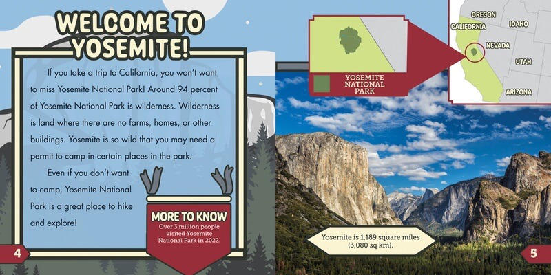 With waterfalls, giant sequoia trees, and granite cliffs, there's a lot to explore in Yosemite National Park! Each year, millions of campers pack their bags and head to Yosemite to take a hiking adventure through this park and nature preserve. Through this book's full color photographs and inviting text, readers will take a trip through Yosemite National Park. Readers will learn not only how the park came to be, but things they can't miss on their own trip through Yosemite National Park.