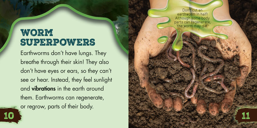 If you've ever played outside, worked in a garden, or gone for a rainy walk you've probably seen a slimy brown worm! Earthworms look as if they have a smooth body. But do they? Worms' bodies are covered with tiny bristles called setae! Worms use setae to help them wiggle and burrow. In this interesting and informative book, young readers will learn all about the lowly worm! They'll uncover how worms' unique adaptations have evolved and why worms are important.