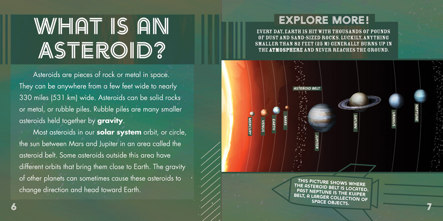 Asteroid collisions are not unknown to our planet. The atmosphere protects Earth from most of these heavenly bodies, but the largest ones can make it through. So far, although large asteroids have permanently altered Earth's terrain and the organisms living on it, no asteroid has yet been destructive enough to completely eradicate the planet. Is this a future possibility? What are scientists' plans in case of such an emergency? This volume examines these questions and more. The age-appropriate main text, supported by engaging fact boxes and enlightening graphic organizers, provides young readers with scientific facts and avoids scare tactics.